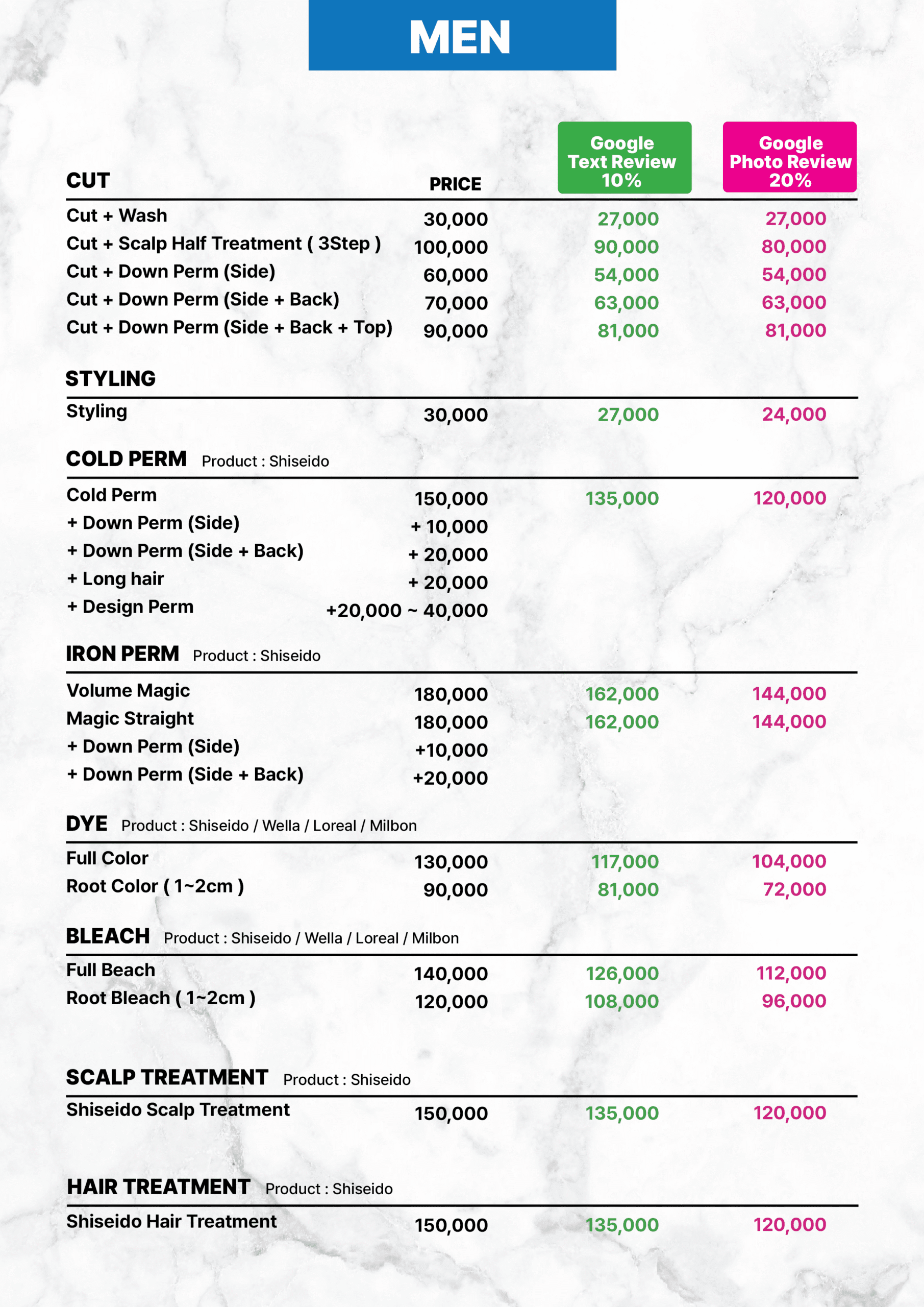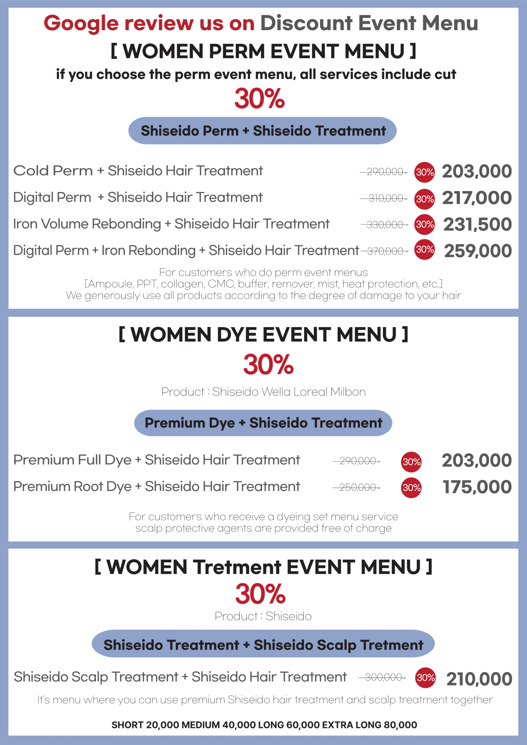ส่วนลดพิเศษเหล่านี้มีเฉพาะที่ ร้าน Korean Seoul Hair Salon ที่คุณไว้วางใจเท่านั้น โดยให้บริการโดยทีมงานผู้เชี่ยวชาญของ Korean Seoul Hair Salon